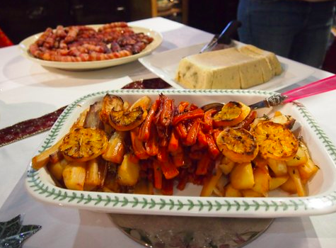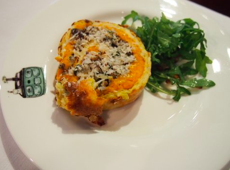 Next we were treated to Claire’s vegetarian Christmas dinner dish. This was a sweet potato roulade stuffed with herbs and topped with a little Parmesan. This recipe was delicious and proved that just because you might not eat meat, it doesn’t mean you have to sacrifice taste. Served with wild rocket and toasted pine nuts we had it as a sort of in between starter and main course!