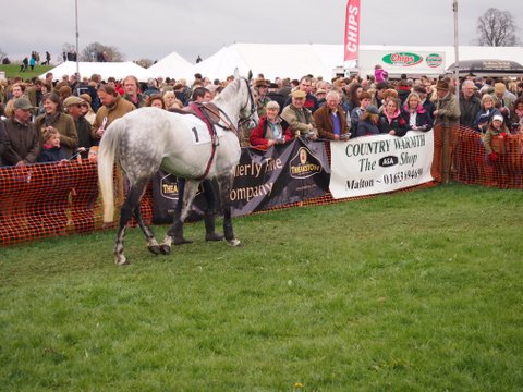 The big race of the day for us was of course the Ladies Open. Jo mason had the last minute ride on the striking grey Blandings Castle as original jockey Pippa Tutty is still recovering from her crashing fall at Wetherby. With Jo’s cousin Jackie Coward as odds on favourite Jo had some big shoes to step in to. However showing her spirit right from the start she led the whole way around. Jackie tried hard on the diminutive Narciso but couldn’t quite match the stride of the big grey, and the scope of his bold jumping style. So victory was Jo’s and as she brightly said it was really a victory for Pippa too.
