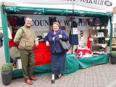 We had fun with our stand; located at the bottom of the market square we decked it out in jubilee colours. Michael found an old pillar box red AGA to put on display (red is no longer made at the AGA foundry, Coalbrookedale any more). We then added touches of patriotic bunting and some lovely aprons from the magical sewing machine of Mrs Madden.  With sayings including ‘Keep Calm your dinner is in the AGA’ and ‘Bake for Britain’ these pinneys were a resounding success. We have had to commission more to keep up with the demand!